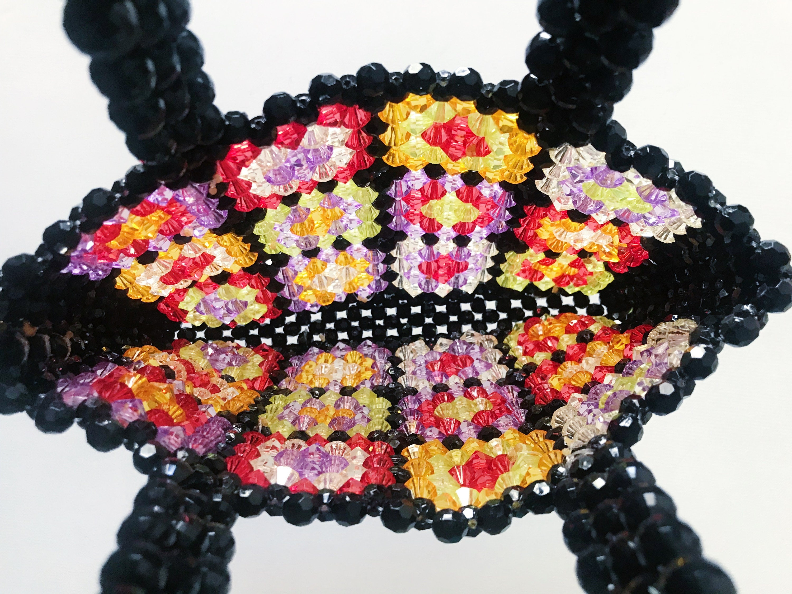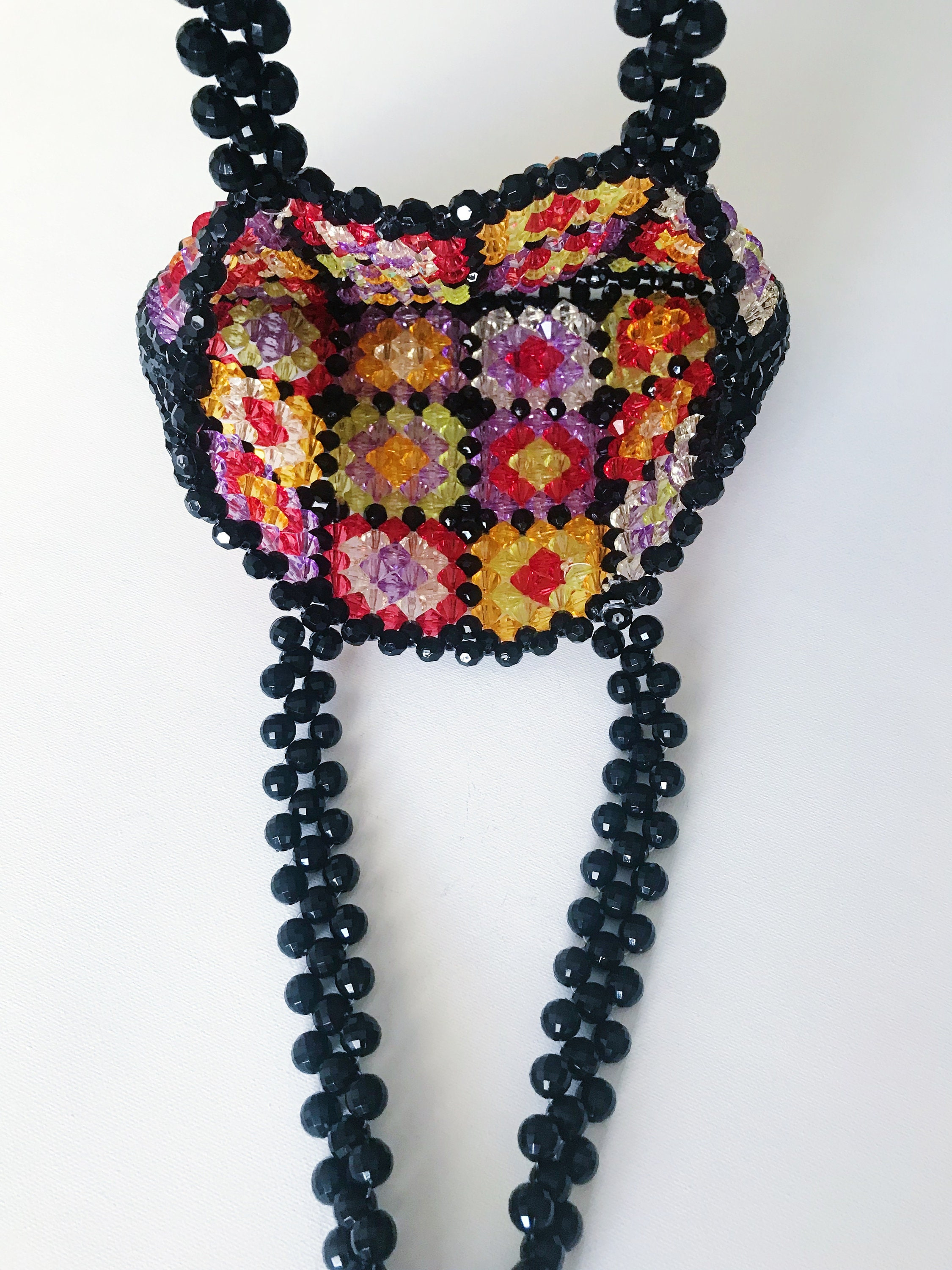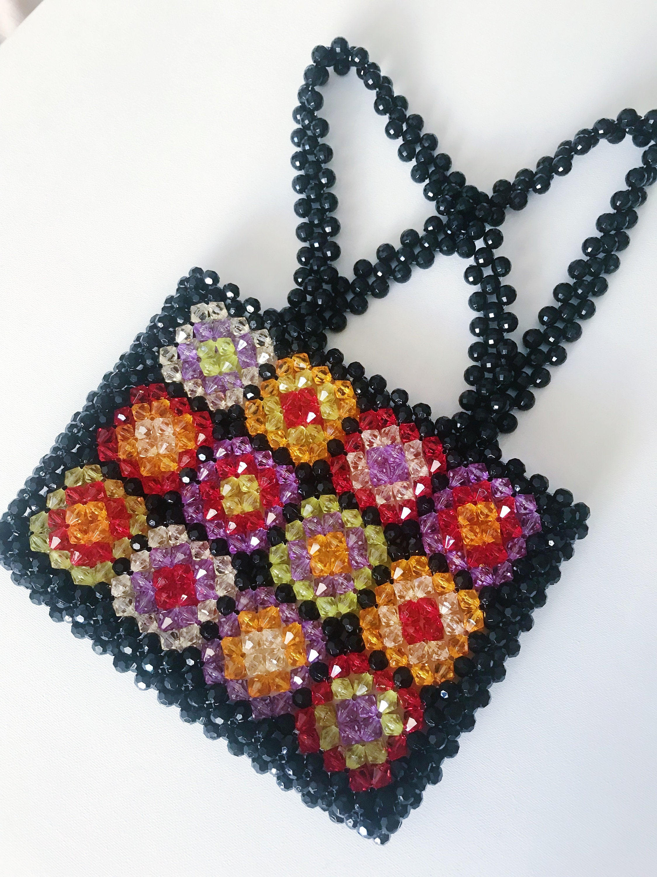 Product DescriptionThis handmade beaded tote bag features a black base with colorful floral granny square-inspired panels for a vintage yet playful look. Bright, artistic, and eye-catching, it is perfect for daily outings, brunch dates, vacations, and statement styling. DetailsBag Size: Approx. 8.7 x 7.9 in / 22 x 20 cmHandle Drop: Approx. 8.3 in / 21 cmMaterial: Beaded construction Selling PointsColorful floral patchwork design with vintage charmBlack beaded frame creates bold contrastHandmade texture adds a unique artisanal feelGreat for daily wear, travel, and standout outfits