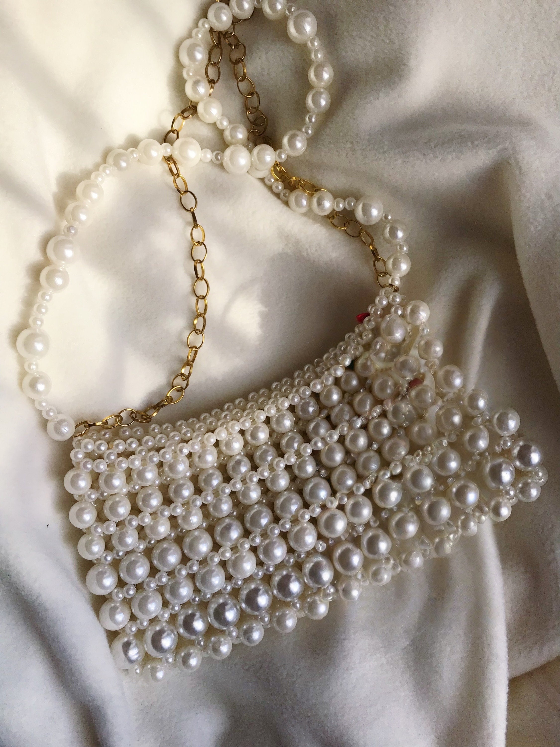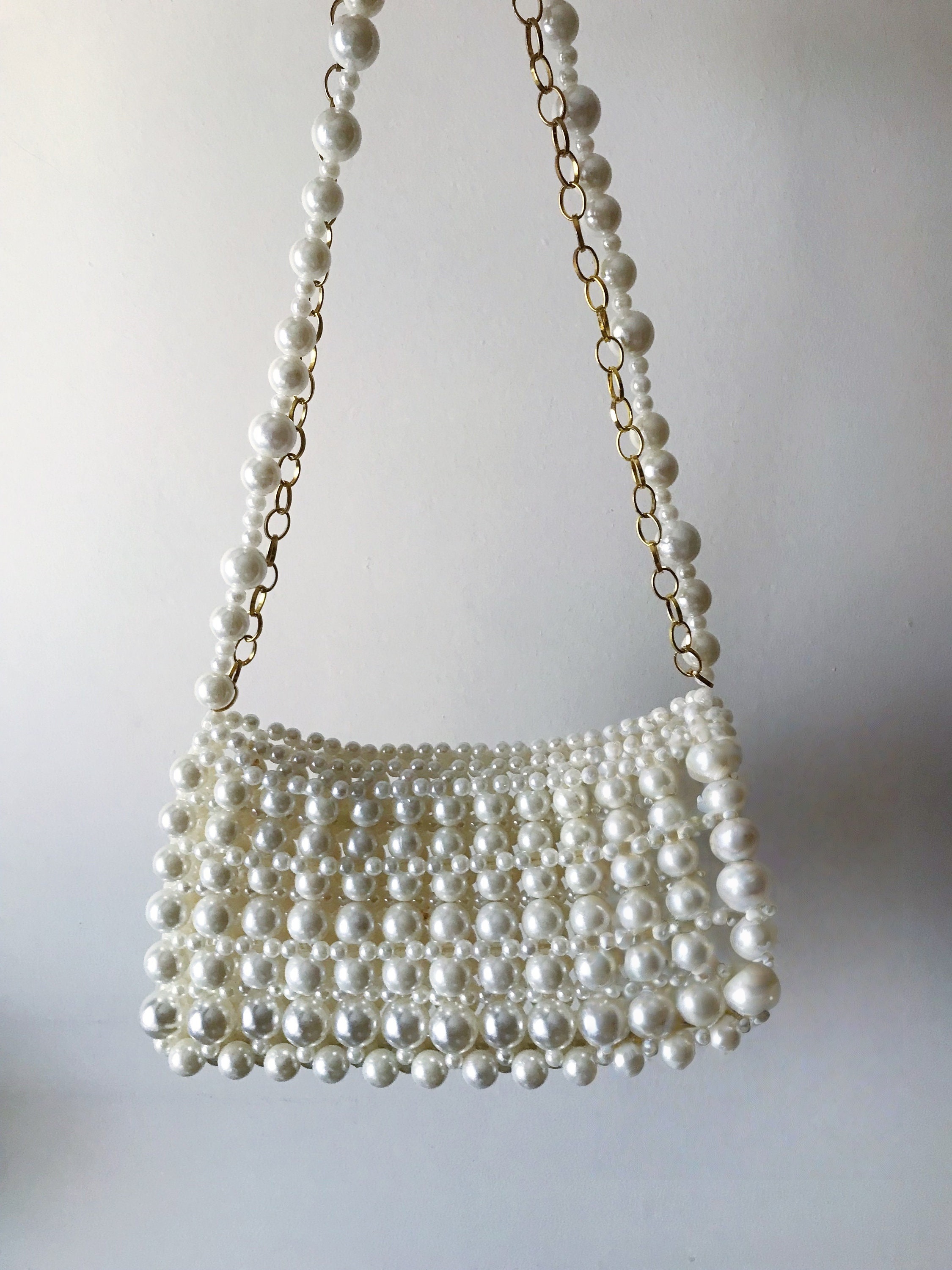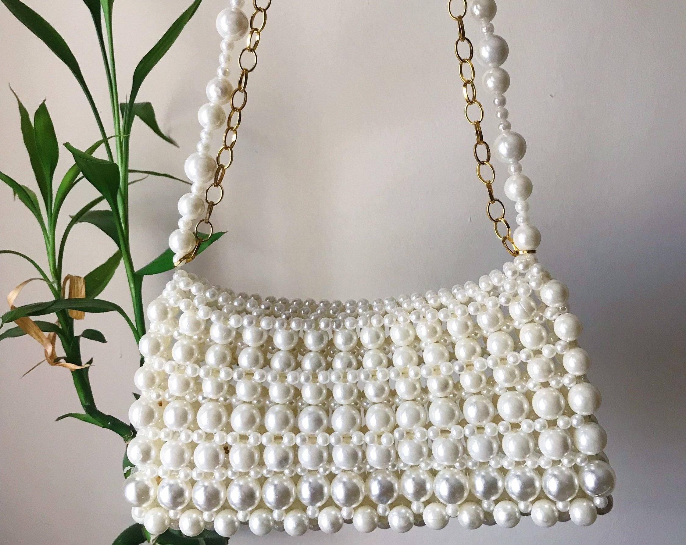 Product DescriptionThis handmade pearl beaded shoulder bag features a sleek rectangular silhouette with glossy ivory beads, a pearl shoulder strap, and gold chain accents for an elegant vintage-inspired look. Chic and refined, it is perfect for parties, dinners, weddings, vacations, and dressy everyday styling. DetailsBag Size: Approx. 9.1 x 5.5 in / 23 x 14 cmStrap Drop: Approx. 10.2 in / 26 cmMaterial: Beaded construction, metal chain strap Selling PointsGlossy pearl beaded design with an elegant finishGold chain accents add a refined touchSlim shoulder bag shape for polished stylingGreat for parties, events, and feminine outfits