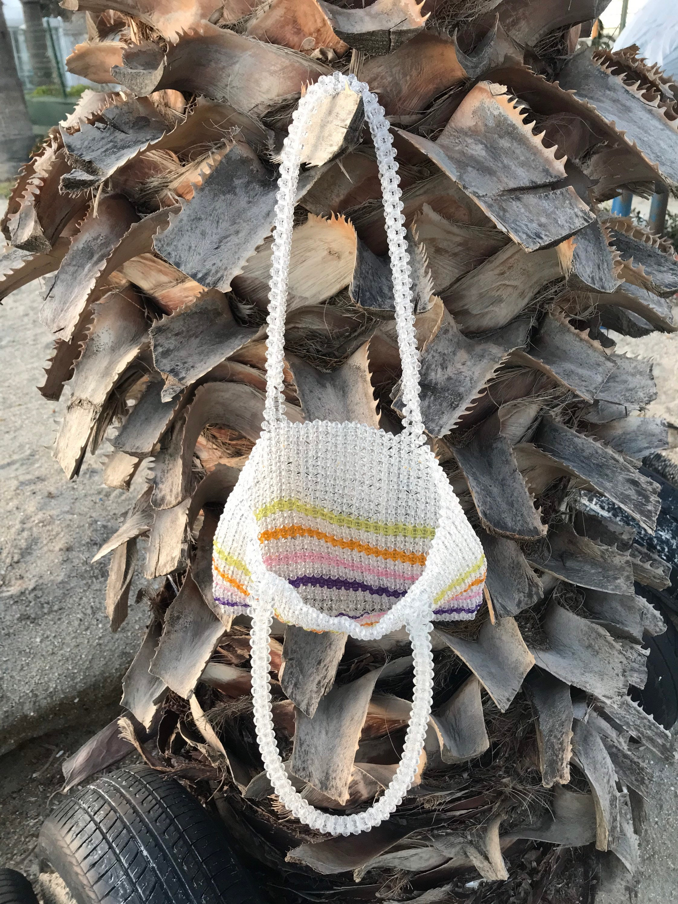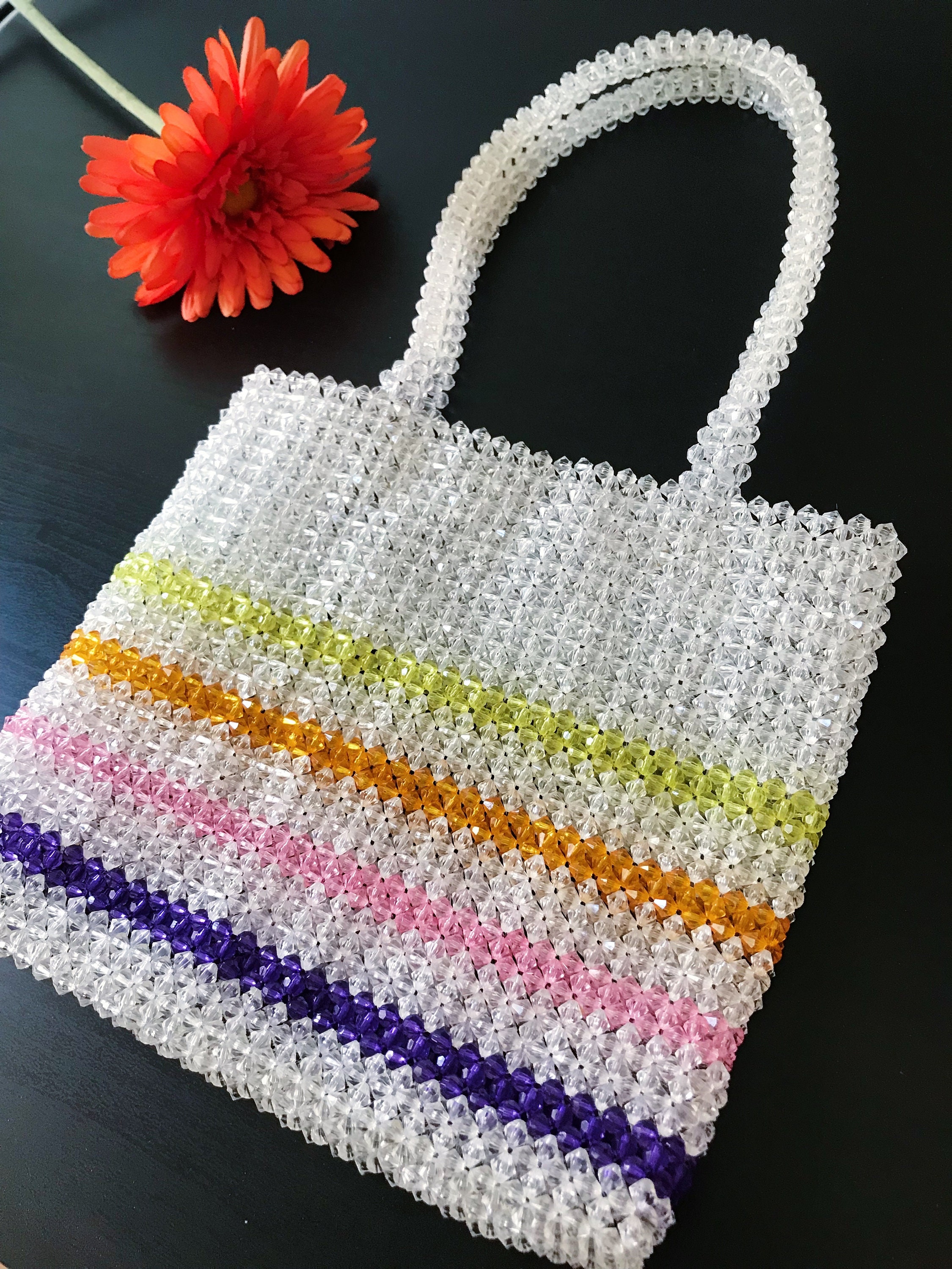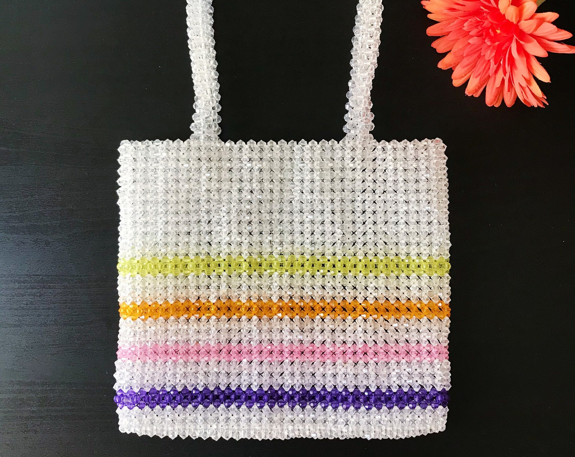Product DescriptionThis handmade beaded tote bag features a clean white base with soft rainbow stripe accents for a fresh and playful look. Lightweight and stylish, it is perfect for daily outings, vacations, brunch dates, and casual summer styling. DetailsBag Size: Approx. 9.1 x 8.7 in / 23 x 22 cmHandle Drop: Approx. 10.6 in / 27 cmMaterial: Beaded construction Selling PointsHandmade beaded design with glossy textureSoft rainbow stripes add a cheerful accentClassic tote silhouette for easy stylingGreat for daily use, travel, and casual outings